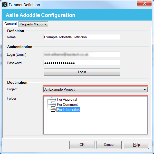 To configure an Adoddle extranet definition, add an 'Asite Adoddle' definition to a project as detailed in the parent topic.