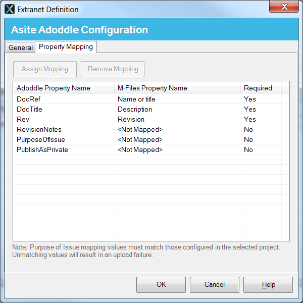 To do this, select the 'Property Mapping' tab in the 'Asite Adoddle Configuration' dialogue box.