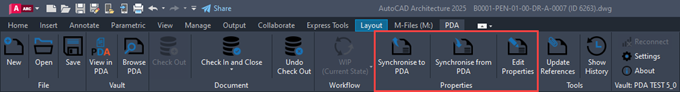 If you have made any changes to the title block attributes during your edit session, you can use this button to force an update of these properties from the title block to the metadata properties held in PentagonDocs Assistant. Any attributes that have been configured to update PentagonDocs Assistant will be synchronised automatically.