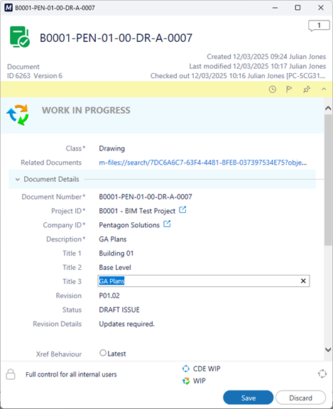 If whilst editing a drawing you change the drawing metadata in the PentagonDocs Assistant client, you can force an update of these properties to the title block from the updated metadata properties in PentagonDocs Assistant.