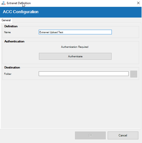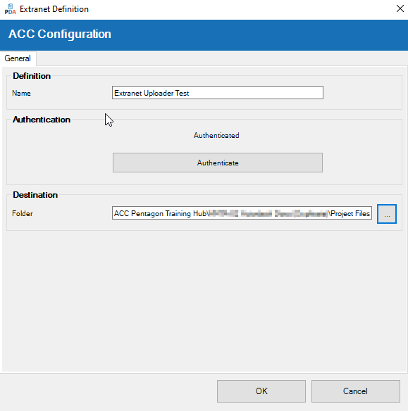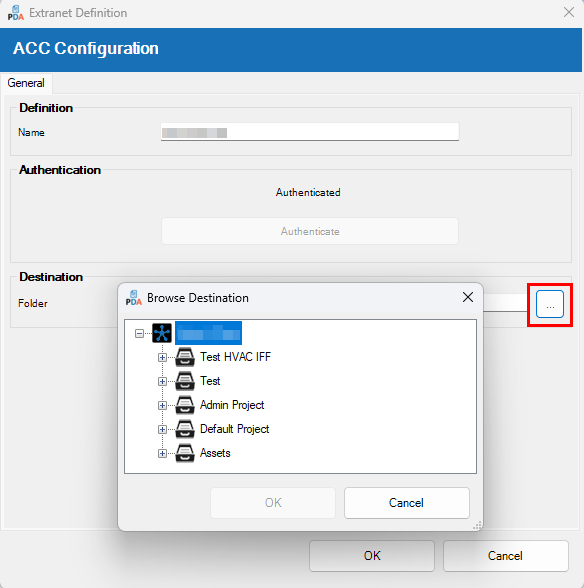 Once authenticated, you can return to the 'ACC Configuration' dialogue box and click the browse button (...) to select a destination folder.