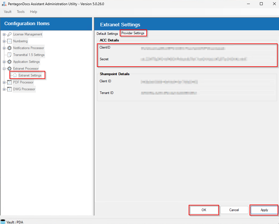 Provide the 'Client ID' and 'Secret' keys. Click 'Apply' and 'OK' to confirm the changes.
