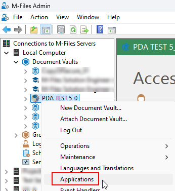 To verify this, launch the M-Files Admin tool, select the desired vault, right-click it for more options and select 'Applications'.