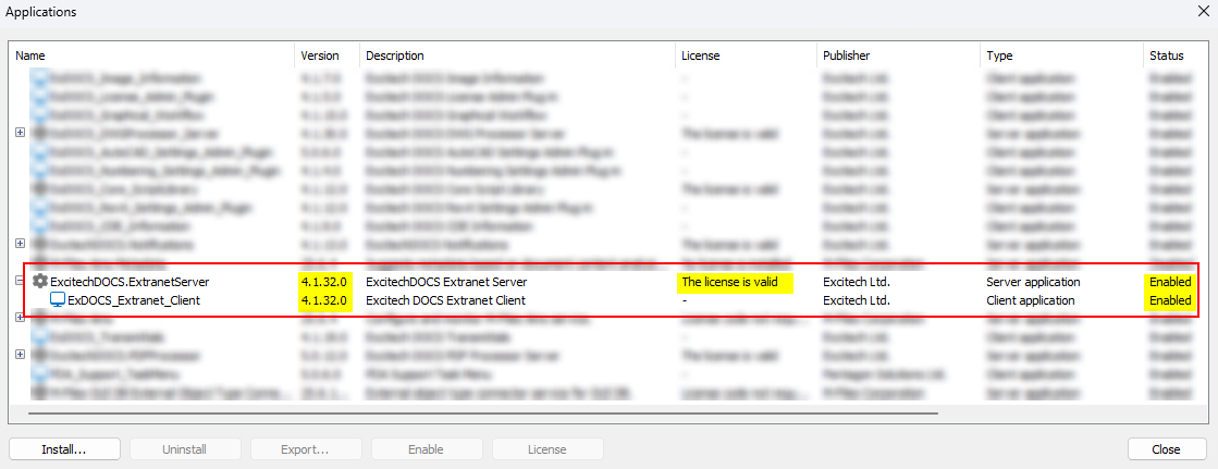 In the 'Applications' dialog, find the 'ExtranetServer' application, expand it and ensure the values you see match the screenshot below, especially the highlighted ones.