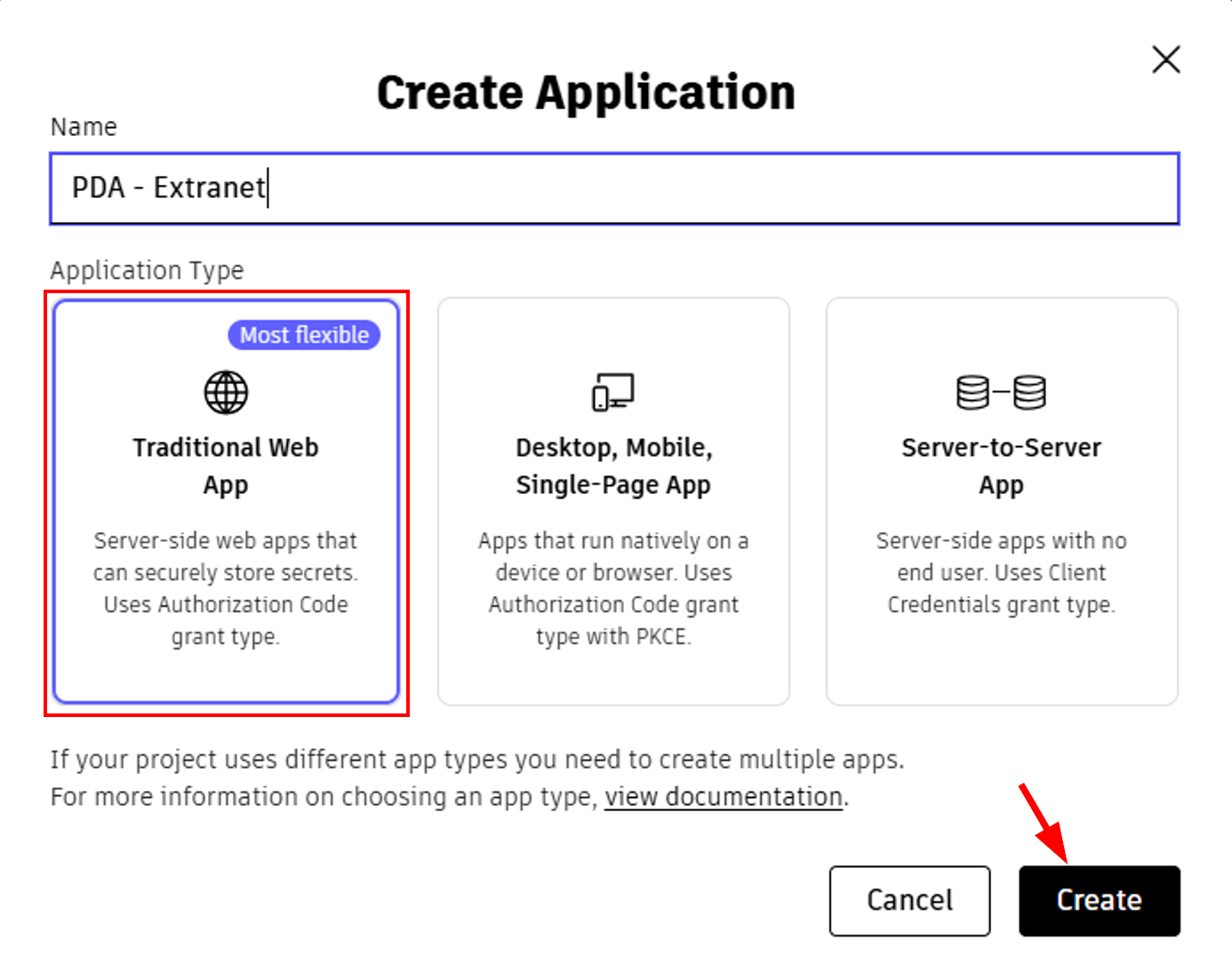 Give the Application a suitable name, ensure you select 'Traditional Web App' and click 'Create'.