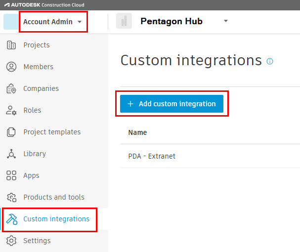 Access https://acc.autodesk.com/, navigate to the 'Account Admin' section, select 'Custom Integration' and then click 'Add custom integration'.