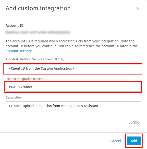 In the 'Add custom integration' dialog box, provide the Client ID you got from the Custom Application, give the integration a suitable name, such as "PDA - Extranet" and then click 'Add'.