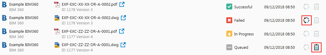In Progress The upload request is currently being processed. Upload requests are processed sequentially in the order in which there were requested. |
