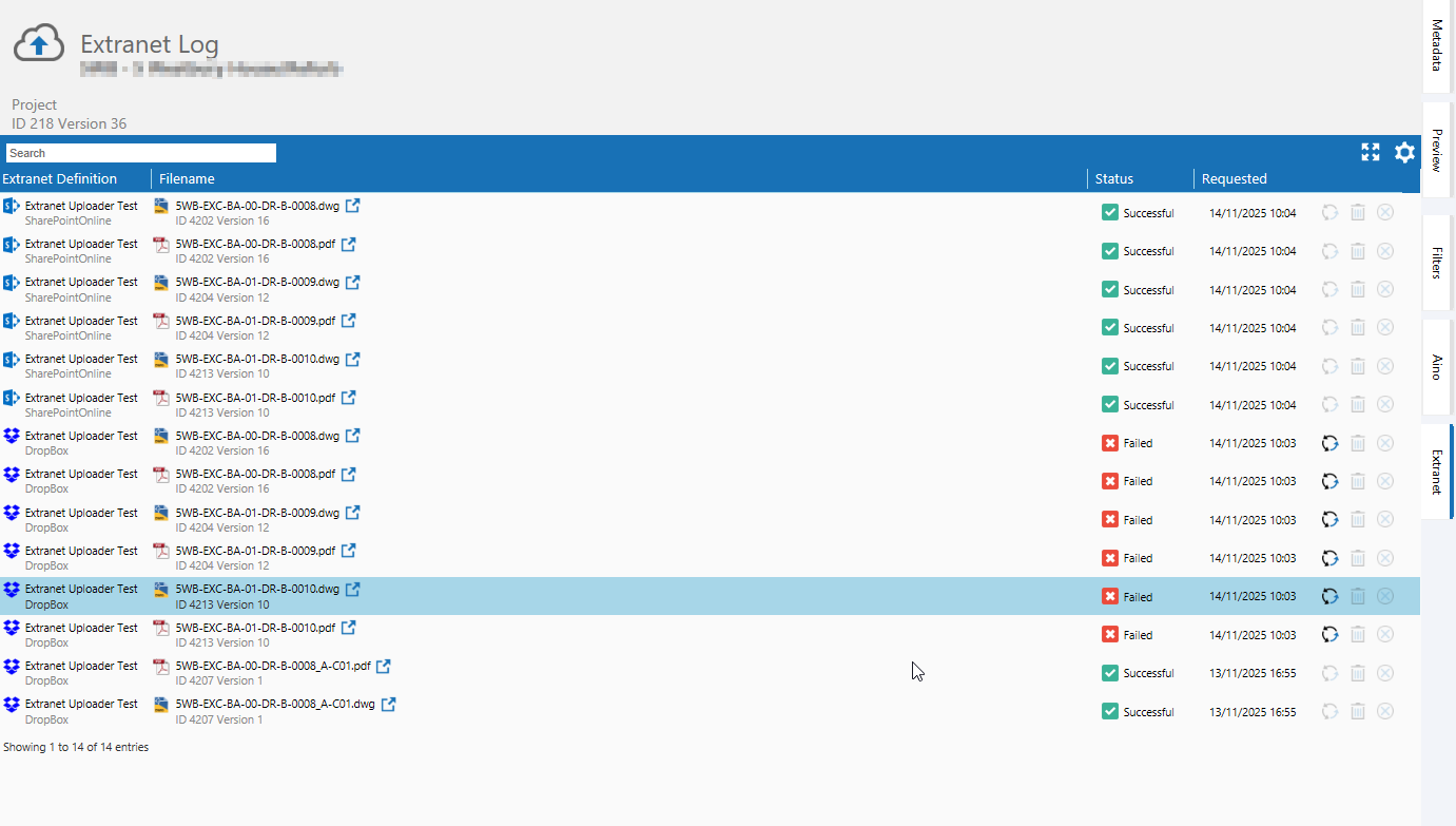 The project log is available by selecting the 'Extranet' tab on a project object. The project log shows all uploads associated with the selected project.