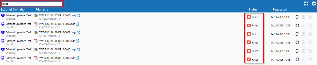 The log header gives details of the selected project name, ID and Version. Log items are listed with details of the extranet definition, filename, status and request date.