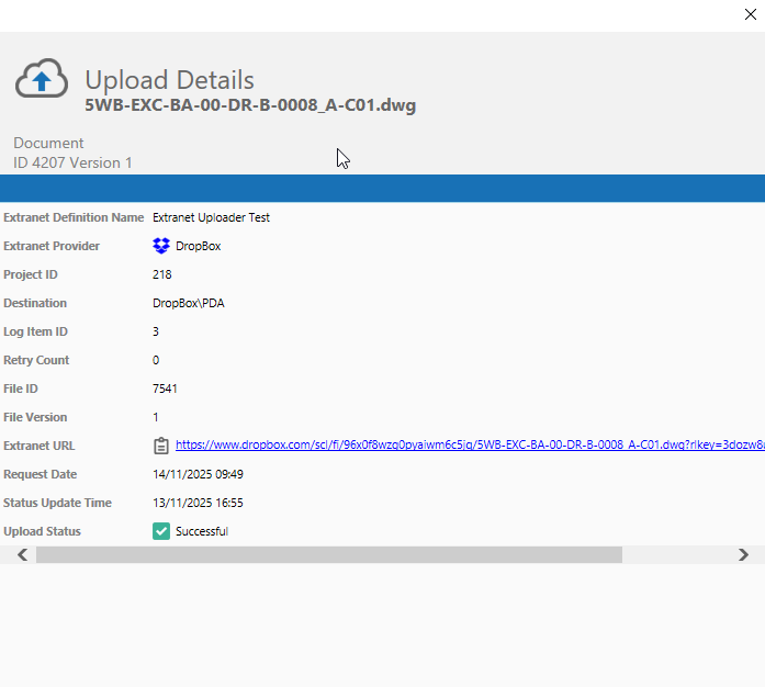 Double-clicking on an item in the project or document queue shows detailed information about that upload request.
