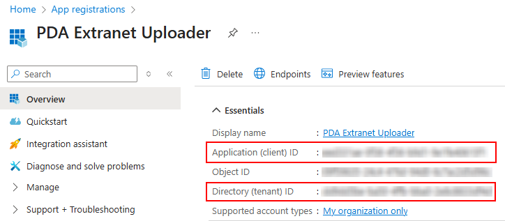 Once this process is complete, navigate to the Overview page for the new App and take a note of its 'Client ID' and 'Tenant ID' - these will be required to finalize your setup.