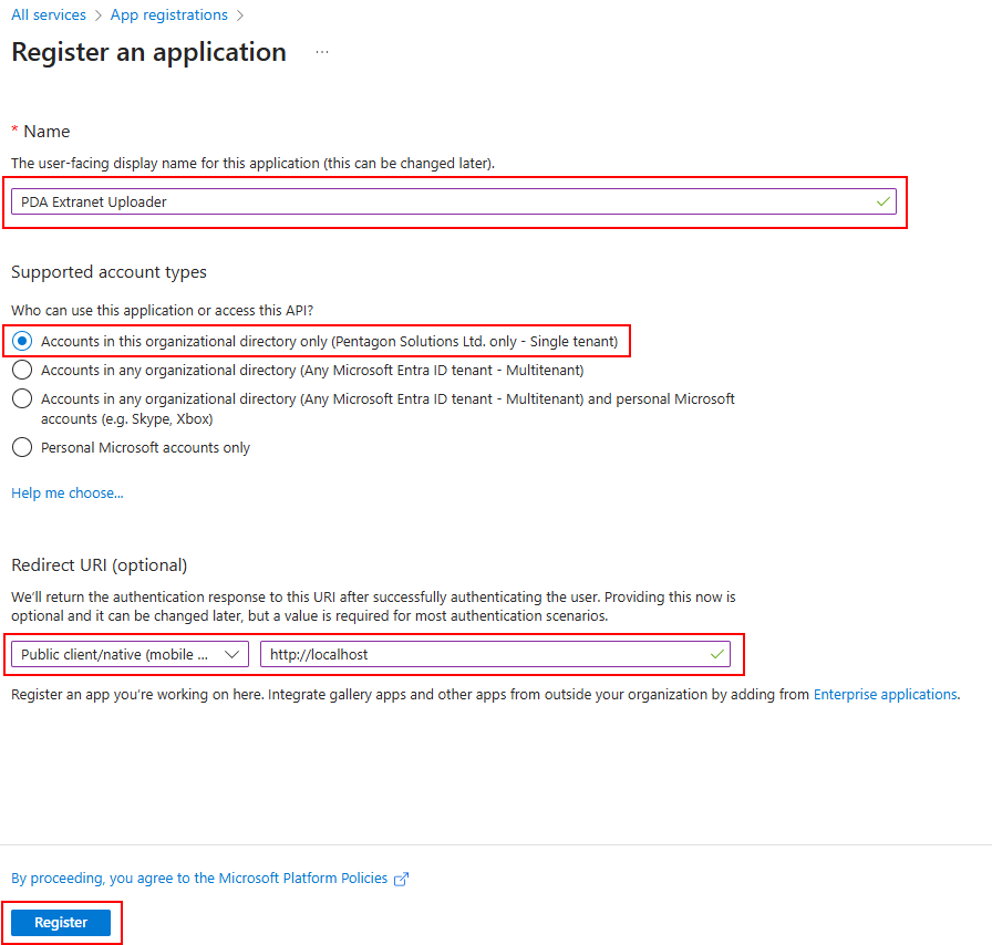 On the Registration screen, enter a suitable name for the application (e.g. PDA Extranet Uploader).