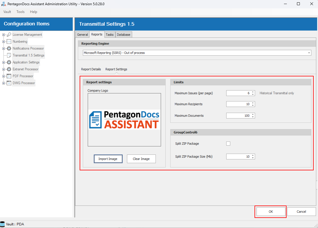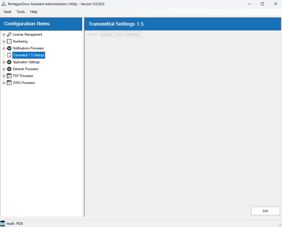 Most of the settings for the vault's Transmittals are configured in the PentagonDocs Assistant Utility, in the "Transmittal 1.5 Settings" section.