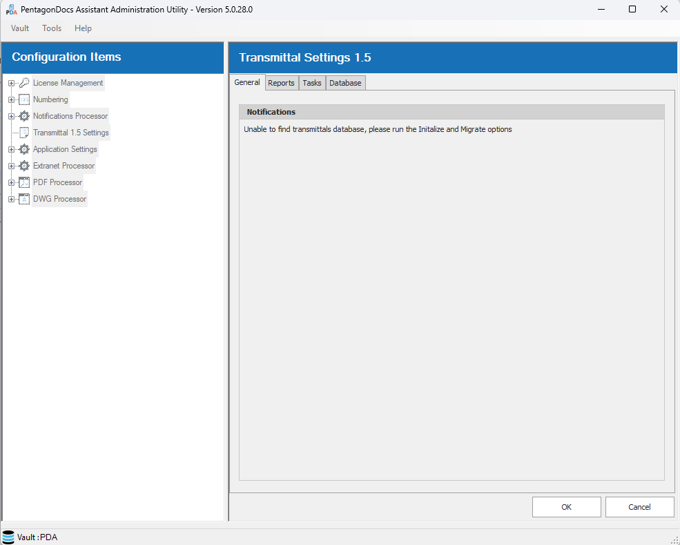 The General tab will show messages related to the current state of the Transmittals 1.5 application. For example, when the server and client Transmittals 1.5 vault applications are first installed, Transmittals 1.5 will require initializing in order to create the vault specific transmittals database. Opening the Transmittals 1.5 Settings in the PDA Admin Utility, the General tab will show the following message “Unable to find transmittals database, please run the Initialize and Migrate options”: