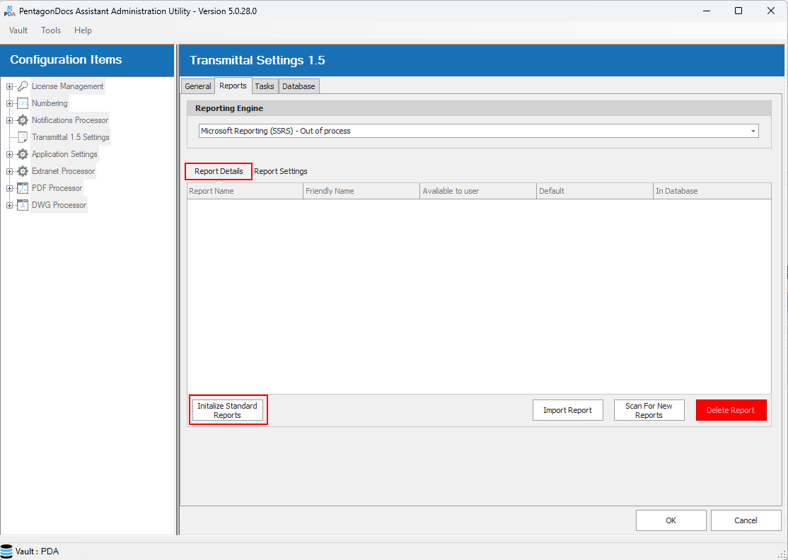 Clicking on the ‘Reports’ tab will show details on the reports available in the vault. When first installing Transmittals 1.5 there will be no Reports shown in the ‘Report Details’ section: