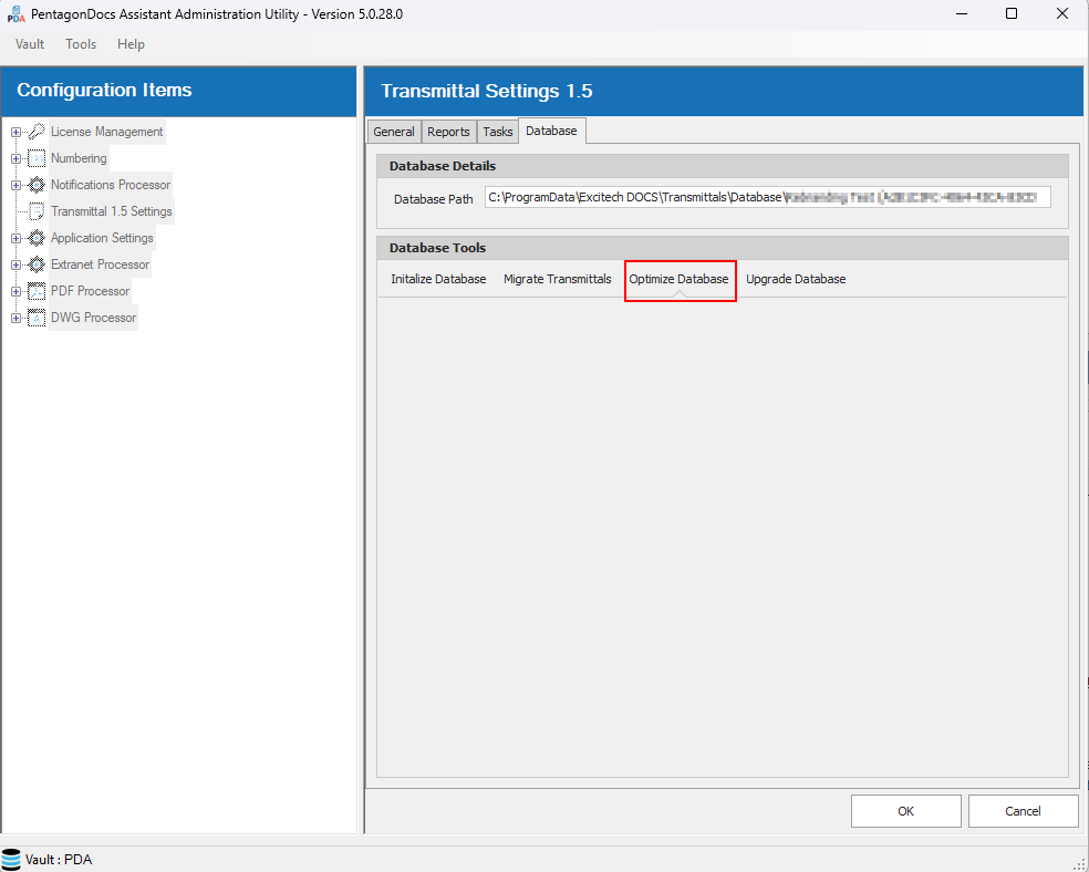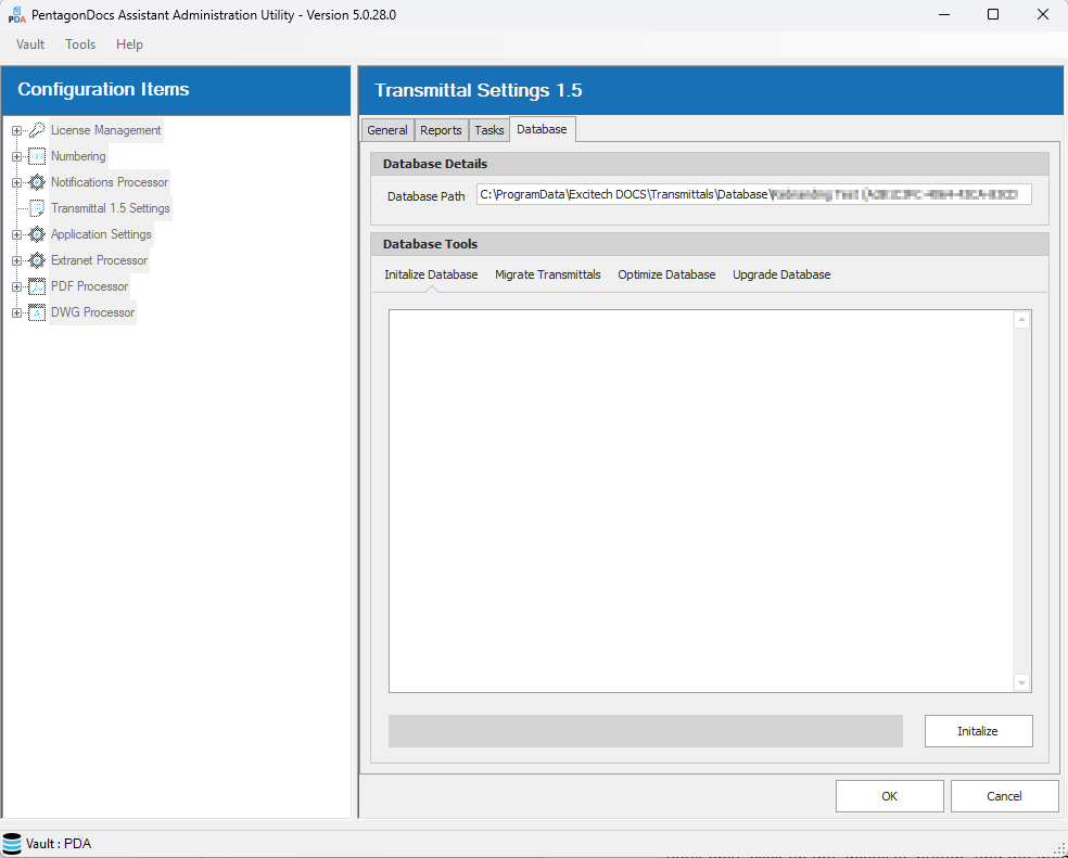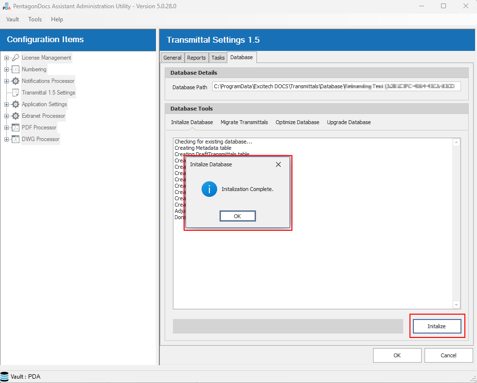 This option should only ever be used when first setting up a vault with Transmittals 1.5. Running this on a vault which has been already setup, will remove all transmittal data resulting in the loss of all previously issued transmittals using Transmittals 1.5. This will create a new database file overwriting any existing database file (a warning is shown). When setting up a new vault only, click on the ‘Initialize’ button, and the database is created: