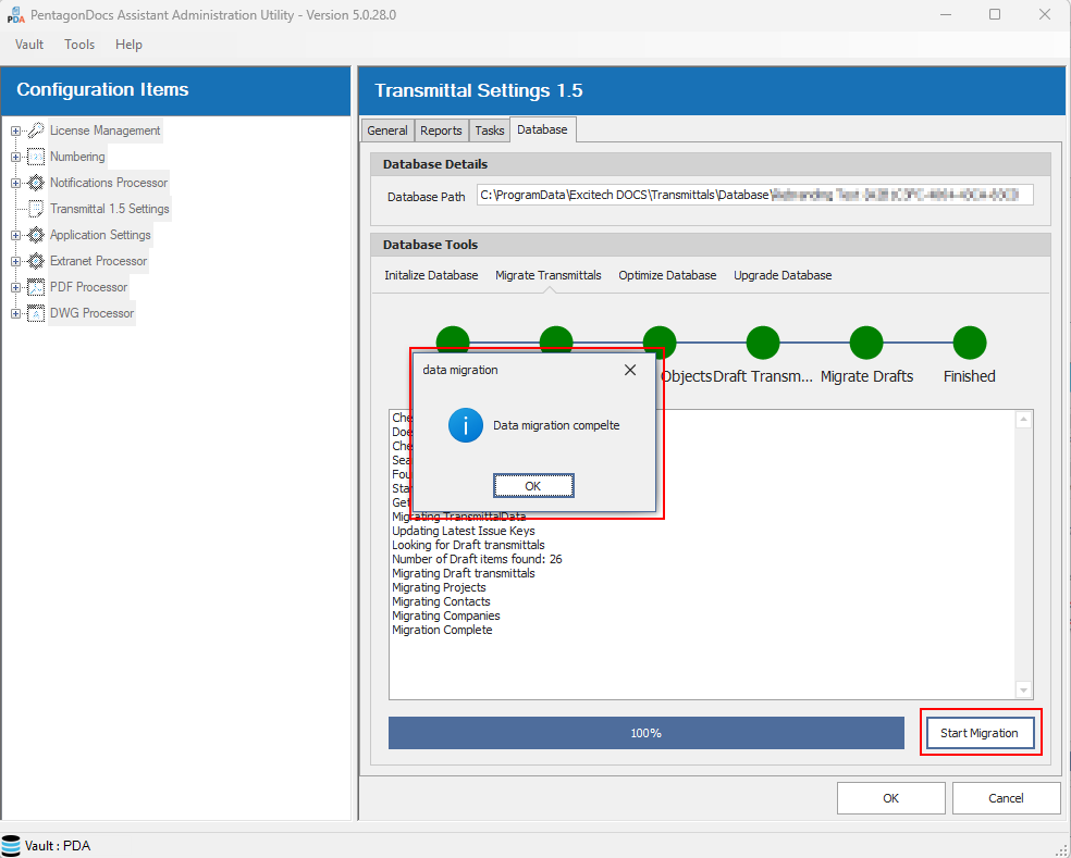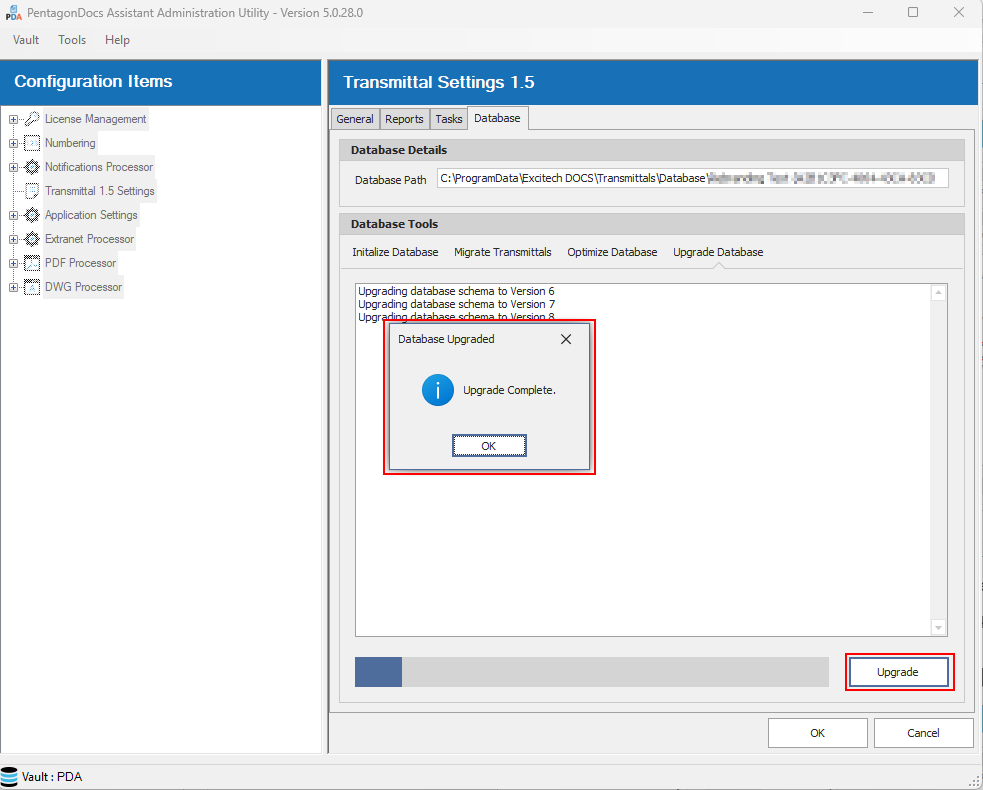 Click ‘OK’ to close the ‘Initialization Complete’ dialog. At this point, ensure that the database is using the latest schema by selecting the ‘Upgrade Database’ tab, and running the ‘Upgrade’ process. When that is completed, return to the ‘Migrate Transmittals’ tab.