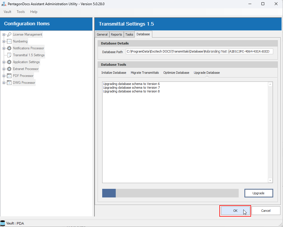 The Transmittals vault application requires the database to be updated to a new schema (a message is shown on the General tab when this is required). This may also be required when creating a new transmittals database following the ‘Initialize Database’ step. Click the ‘Upgrade’ button to carry out the upgrade: