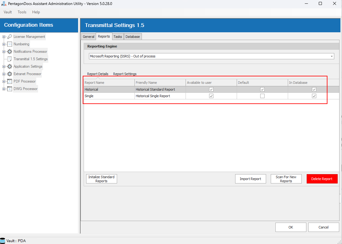 Click on the ‘Initialize Standard Reports’ button to install the standard reports. Should the reports not be shown immediately, click on the ‘General’ tab, and then reselect the ‘Reports’ tab. The default reports will be shown, with the Historical report set as default (the dialog may need to be resized to show all details including the ‘Delete Report’ button):