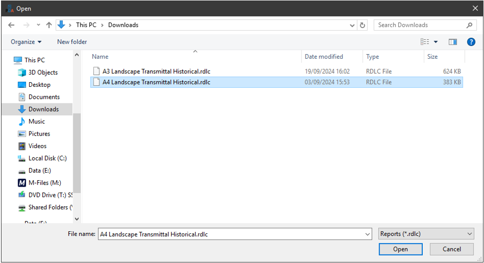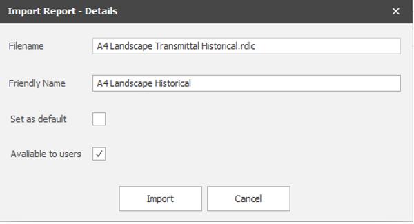 Transmittals 1.5 also supports multiple custom reports that can be imported using the ‘Import Report’ button. Custom reports will first need to be created using the Microsoft RDLC report writer, then placed in an area accessible on the server so that they can be imported. Click on the ‘Import Report’ button and browse to select the custom report: