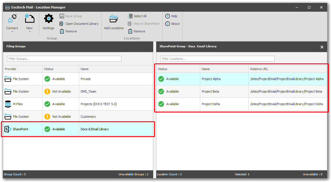 Each Group can have as many filing locations as you need. In the example below we have configured one Group for the Document Library called 'Docs & Email Library'. Whilst the library may have many sub-folders we have configured just 3 of them for email filing.