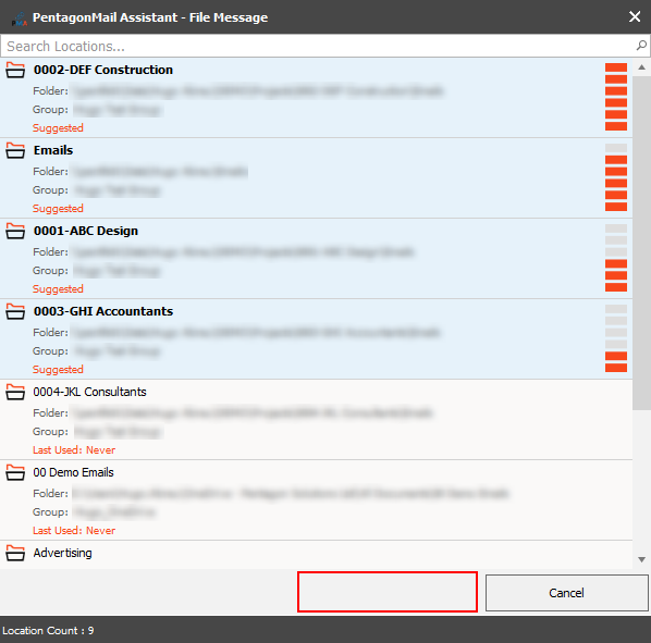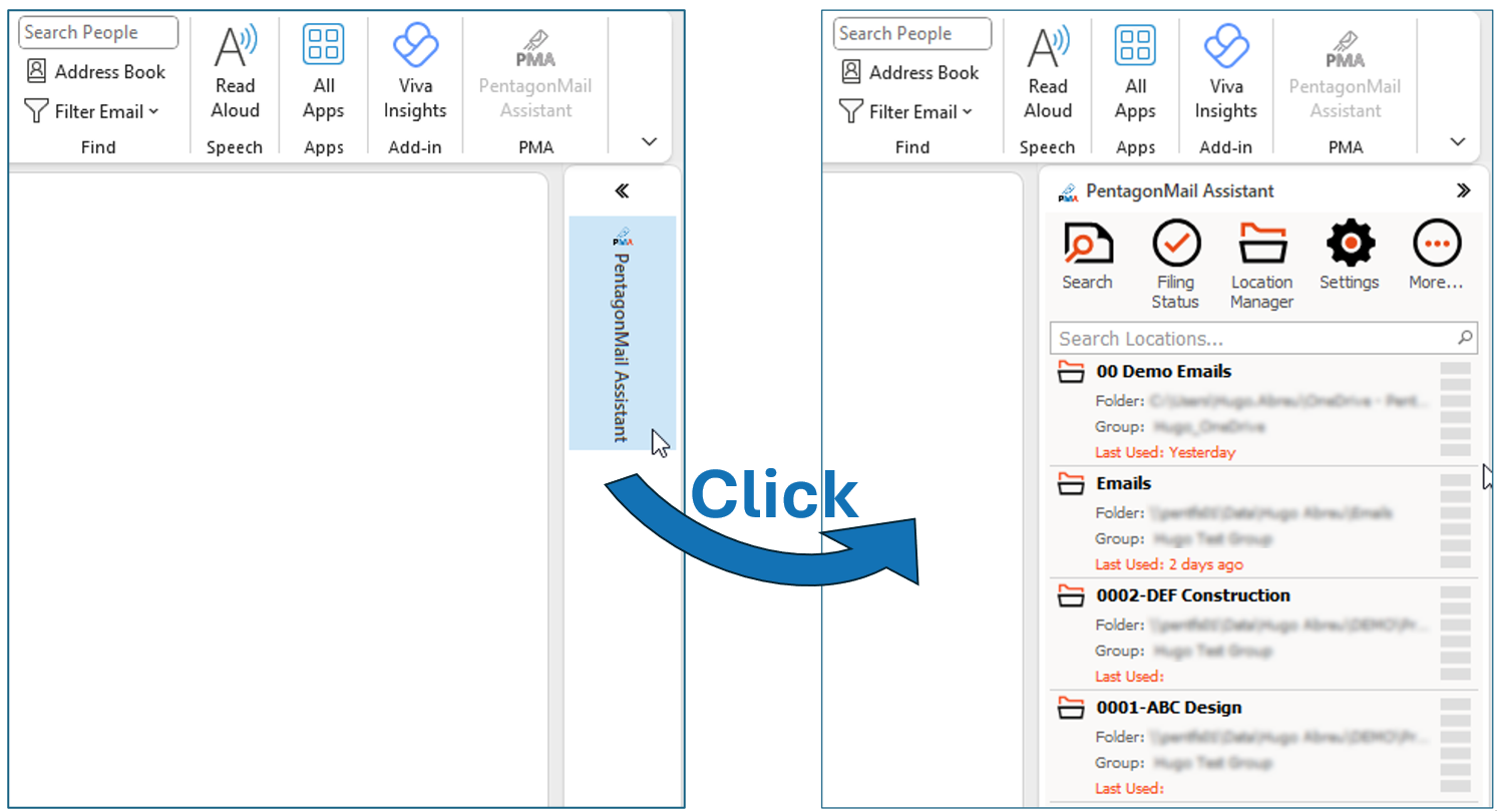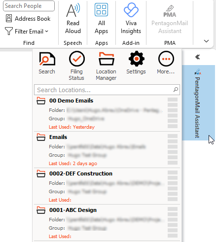 For those who like minimizing the PentagonMail Assistant side menu/bar to maximize their reading space, the sidebar overly behaviour allows the temporary expansion of the filing locations when you need to file messages - as shown below. The sidebar 'floats' in front message content and collapses once again, as soon as you click away from it.