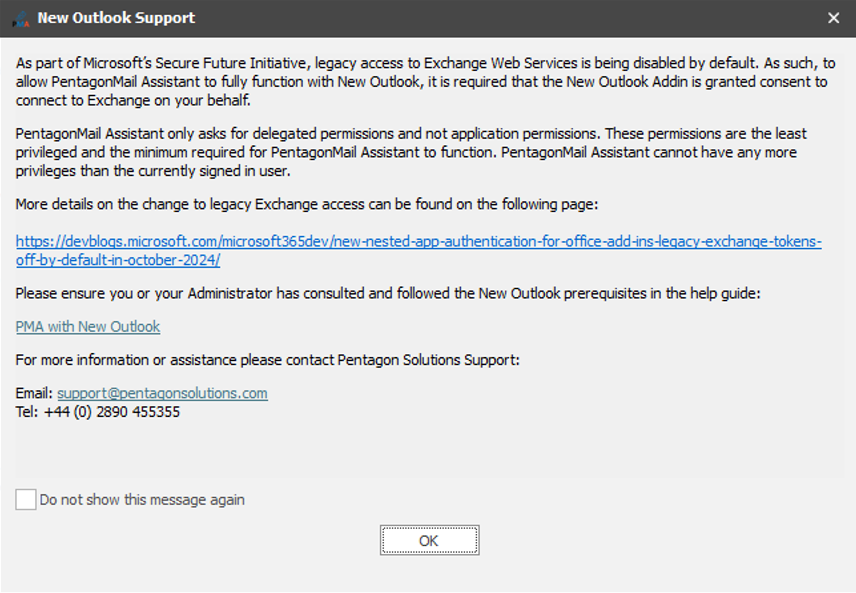 Upon activating New Outlook support, the user will be presented with the below notice. This explains the Exchange permissions required for PentagonMail Assistant to fully function with New Outlook.